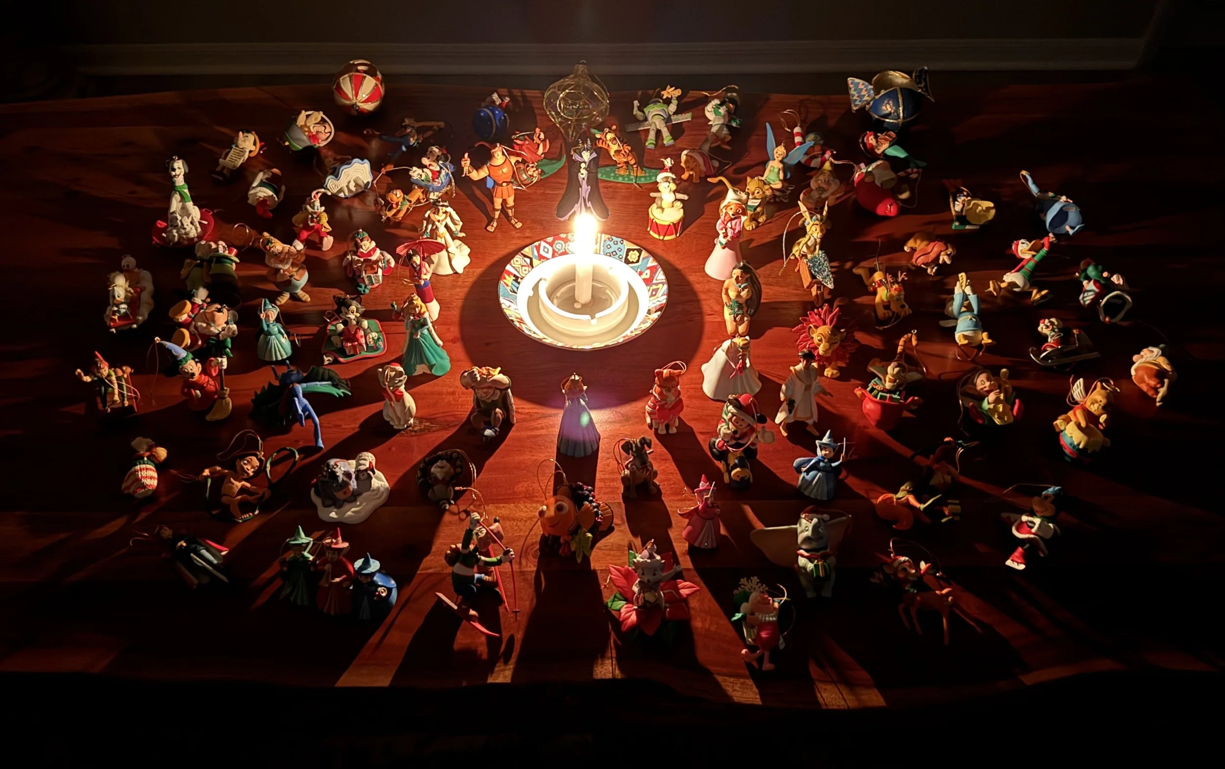 My friend Peter passed away several years ago. This year, his wife gifted me and my husband Peter’s beloved collection of Disney ornaments. His wife told us “Peter will be most happy knowing his ornaments are in a good home.” As we were preparing our Christmas decorations, my husband arranged all the ornaments on our dining room table. He then placed a candle in the middle and lit it. My husband said the candle would help light Peter’s journey, in whatever form that might be at this moment. Then we said a few words of thanks to Peter for letting us have his collection.